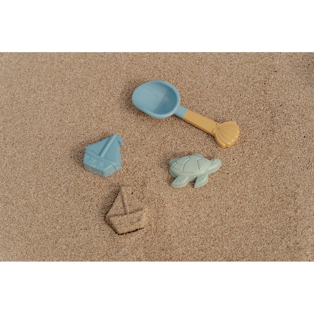 Laten we kunst maken met zand! Met dit schepje en twee vormen kun je al je fantasie gebruiken om prachtige zandkunst maken op het strand of in de zandbak! Strand speelgoed meenemen is een fijne manier om je kleintje een middag lang geïnteresseerd en bezig te houden. Deze set bevat een schepje en twee zandvormen: een groen schildpad en blauwe zeilboot. Allemaal ontworpen voor kleine handjes om een goede grip en veel plezier met zand te hebben.