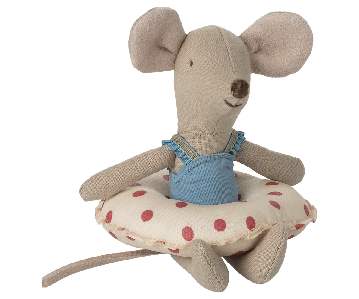 Deze zomerset bestaat uit een klein zusje muis, gekleed in een blauw badpak met een rode stippellijn rond haar buik. Ze is nu klaar voor een veilige duik in zee.