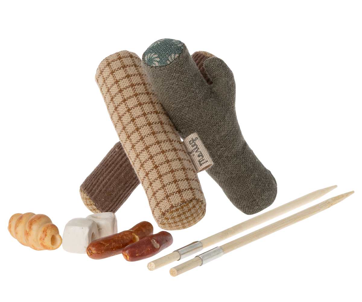 Als de wandelmuizen op pad zijn, zitten ze graag bij het vuur en bereiden ze hun eten. Deze set bevat stokjes, voedsel en takken. De stokjes hebben een klein metalen onderdeeltje zodat de wandelmuizen ze met hun magnetische pootjes kunnen vasthouden.