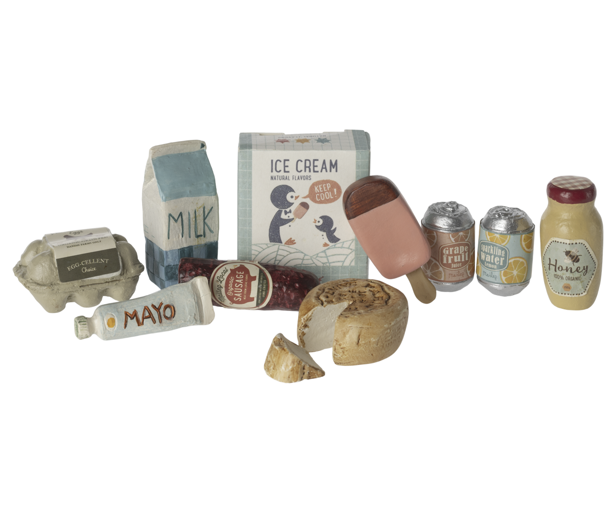 Alles wat je Maileg-vriend nodig heeft. Deze selectie aan eten bestaat uit mayonaise, melk, een pot honing, worstjes, 4 ijsstokjes, eierdozen, 2 blikjes frisdrank en kaas. Het wordt geleverd in een doos. Er kunnen kleine afwijkingen in het schilderij voorkomen.