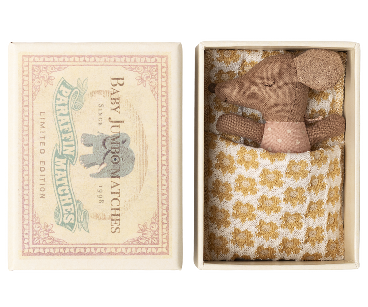 Een klassieker van Maileg. Deze muis is klaar voor urenlang speelplezier en slaapt heerlijk in het luciferdoosje. De kleding en het beddengoed zijn gemaakt van zachte stoffen met unieke prints in prachtige kleuren.