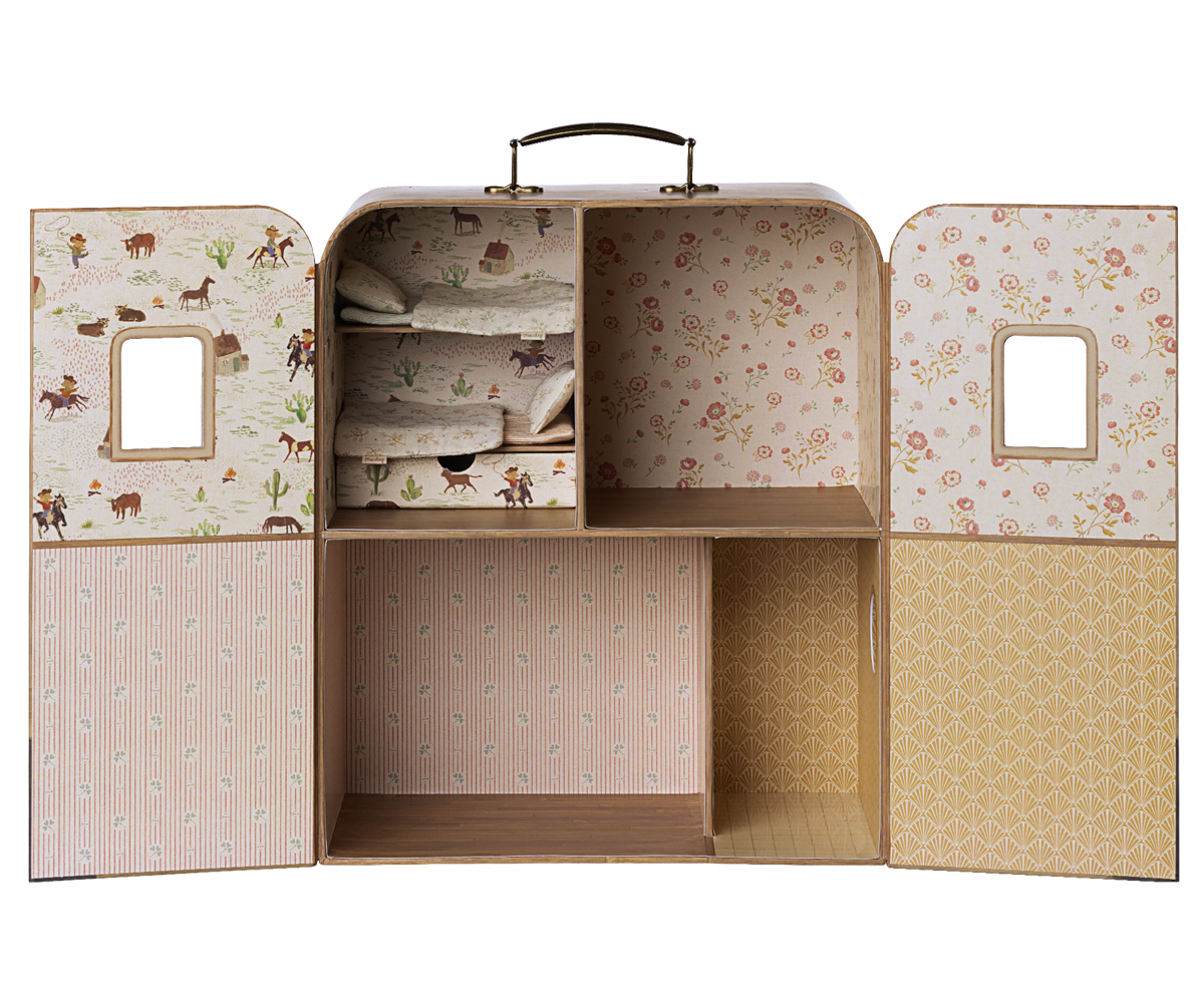 Welkom bij SuitCasa – een klein, draagbaar huisje. Het is geschikt voor de grootte van: Kleine broer en zusje muisjes. Twee sets zacht beddengoed voor je vriendjes zijn inbegrepen, maar je kunt diverse andere kleine meubels kopen om het huisje mee te decoreren.