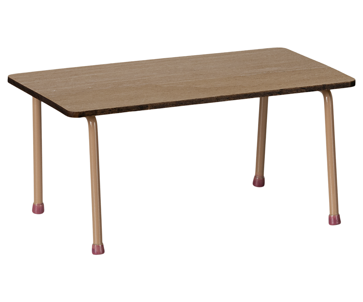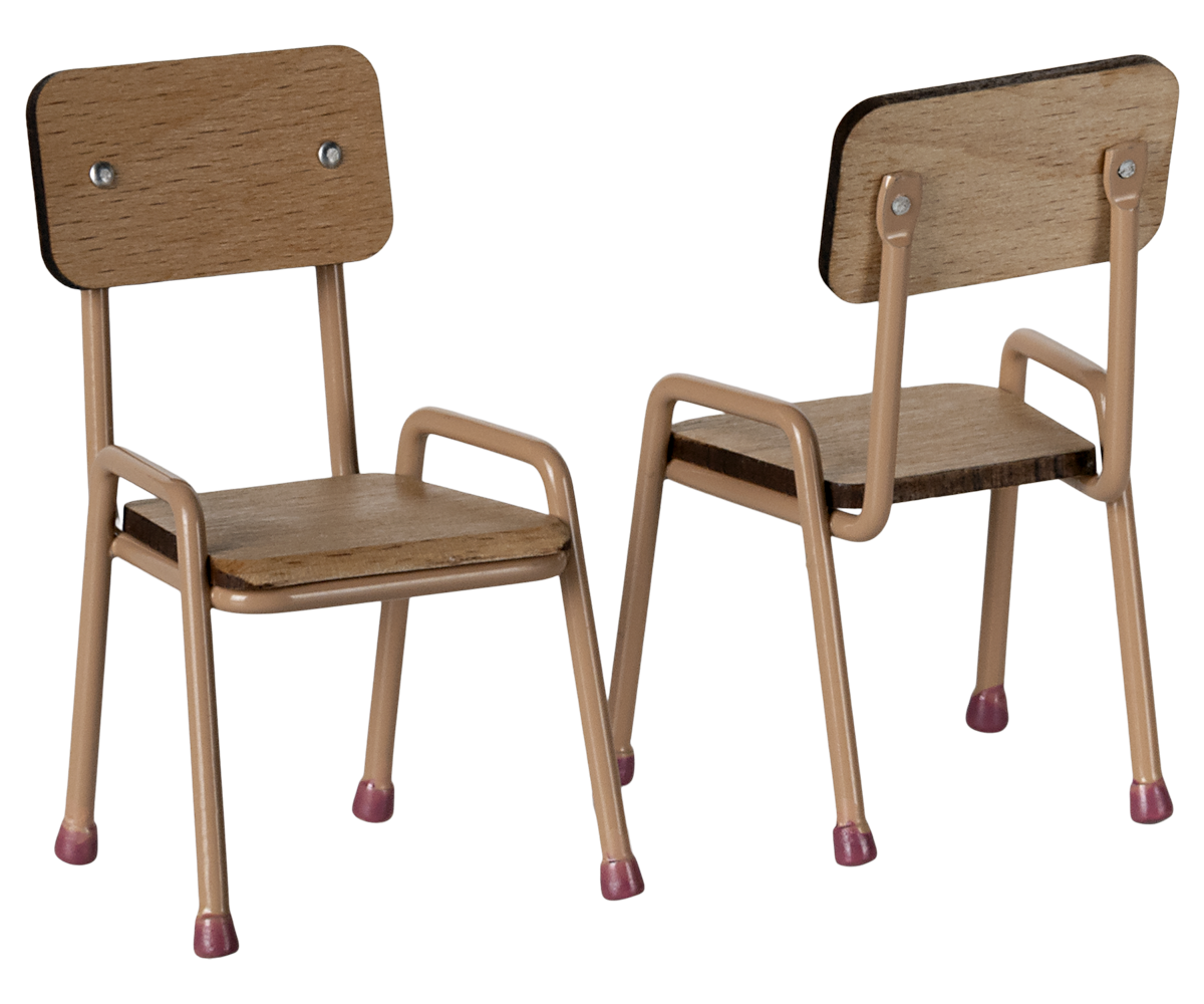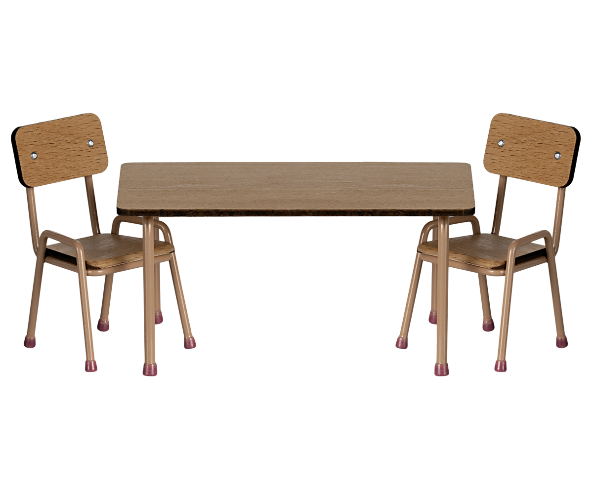 Tafel en stoelenset die past bij de Mouse hole Farmhouse. Gemaakt van beukenhout met metalen poten. Let op de handgemaakte kleurdetails op de poten – zowel op de tafel als op de stoelen. De set wordt geleverd met 2 stoelen.